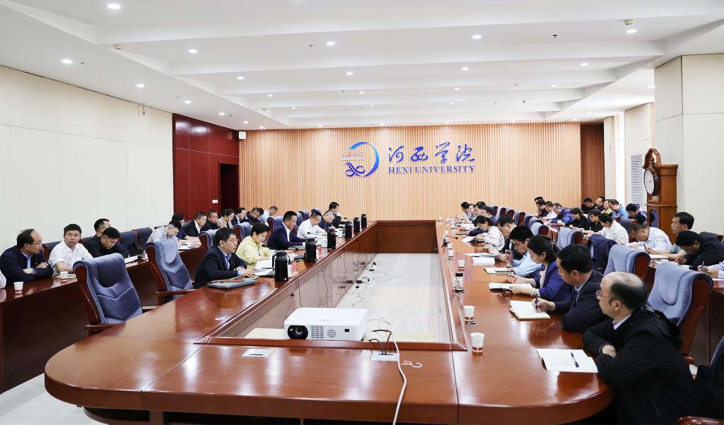 会议强调,一是全面加强党的领导,着力构建“大思政”格局。始终坚持马克思主义指导地位,把党的领导贯穿办学治校育人全过程,坚持思政课建设与党的创新理论武装同步推进,切实加强以习近平新时代中国特色社会主义思想为核心内容的课程教材体系建设,深入推进大中小学思想政治教育一体化建设;以中国特色社会主义取得的举世瞩目成就为内容支撑,以中华优秀传统文化、革命文化和社会主义先进文化为力量根基,把道理讲深、讲透、讲活;全力打造政治强、情怀深、思维新、视野广、自律严、人格正的思政课教师队伍,不断开创新时代思政教育新局面。二是抢抓政策机遇,全力推动学校重点工作落地见效。以本科教育教学审核评估和师范专业认证为契机,加强教学科研团队建设,开展有组织教学和有组织科研,聚焦课程建设和学科专业建设,在高层次教学科研成果方面取得新突破。深入学习贯彻习近平总书记关于加强和改进民族工作的重要思想,坚持用共同理想信念凝心铸魂,有形有感有效抓实铸牢中华民族共同体意识工作,全力推进铸牢中华民族共同体意识示范校建设,着力推动省部共建。三是深入开展党纪学习教育,全面推进依法治校。切实把思想和行动统一到党中央决策部署上来,把开展党纪学习教育作为重要政治任务,明确党纪学习教育是加强党的纪律建设、推动全面从严治党向纵深发展的重要举措。把开展党纪学习教育与贯彻落实第四次党代会精神相结合,与整治群众身边不正之风和腐败问题集中结合,与保密、信访、法治等实务工作结合。强化系统思维,完善内部规章制度,坚持破立并进、纠建并举,扬正气、破风气,全面落实依法治校,推进学校治理现代化。四是铆足拼劲聚力攻坚,加快推动学校高质量发展。增强政治意识,用好用足用活政策,紧盯办学目标,全力补短板、强弱项、挖潜力。始终把师生放在心中最重要的位置,坚持师生办学主体地位,全心全意服务师生,牢固树立改革问计于师生,发展依靠师生,发展为了师生,发展成果让师生共享的理念,用广大干部的“辛苦指数、奋斗指数”换取学校事业的发展指数和师生的“幸福指数”。