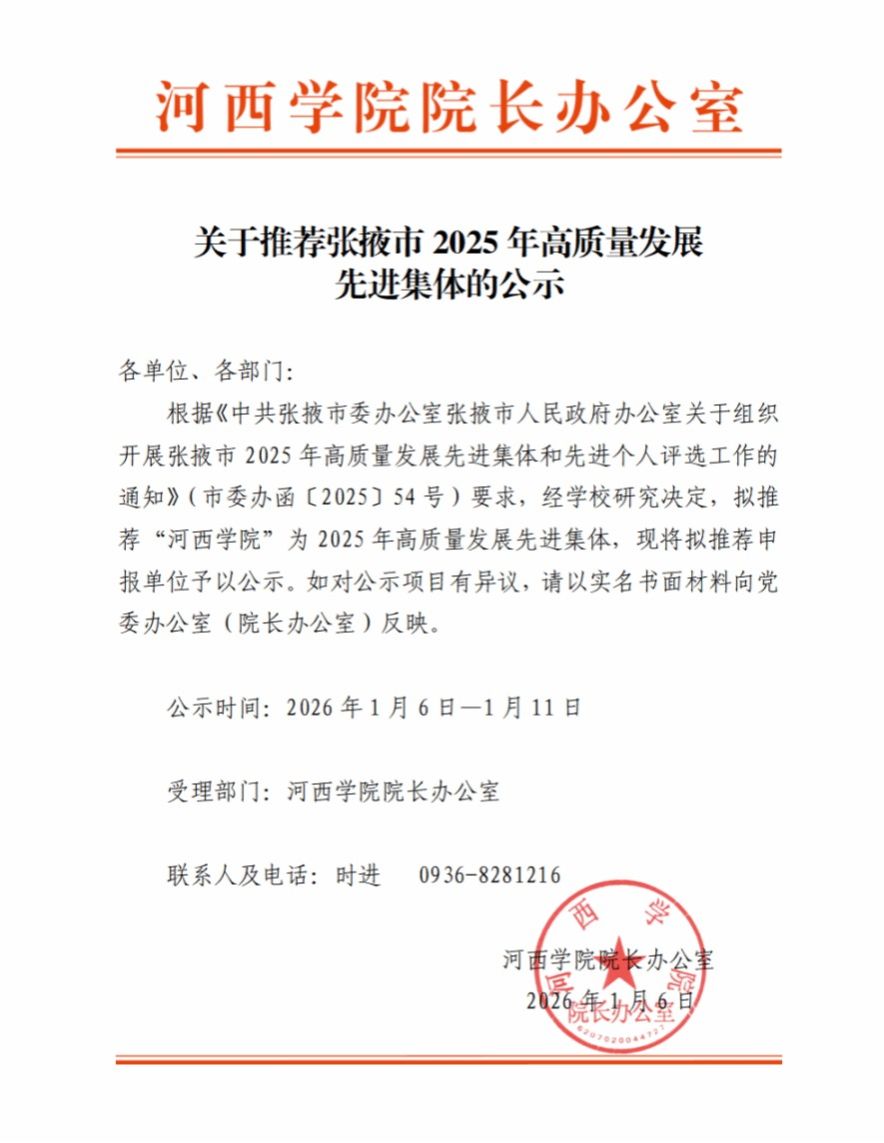 关于推荐张掖市2025年高质量发展先进集体的公示